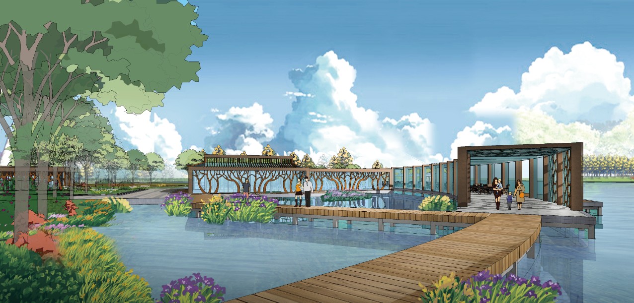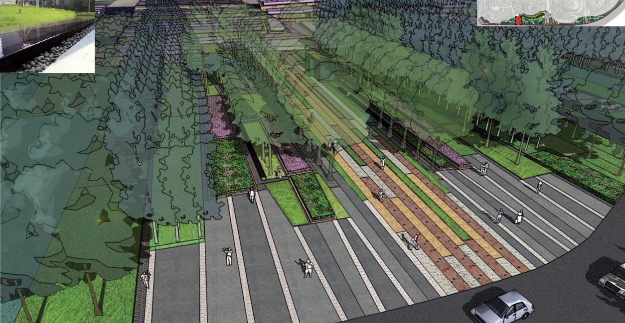 鄭州市鄭東新區龍子湖濱河公園設計要充分尊重自然,以生態設計手法詮釋景觀,將環境教育、體驗活動與景觀環境相融合,形成一條生態綠肺;在龍子湖濱河公園內,充分利用場地地形,結合海綿城市理論體系,打造一條雨水收集、徑流導引、水體過濾的生態綠帶,營造成海綿城市中的先行試驗田;依托現有地形,營造出一塊可以自我修復、過濾水系的人工濕地,通過雨水收集、徑流導引最終聚到河流內。