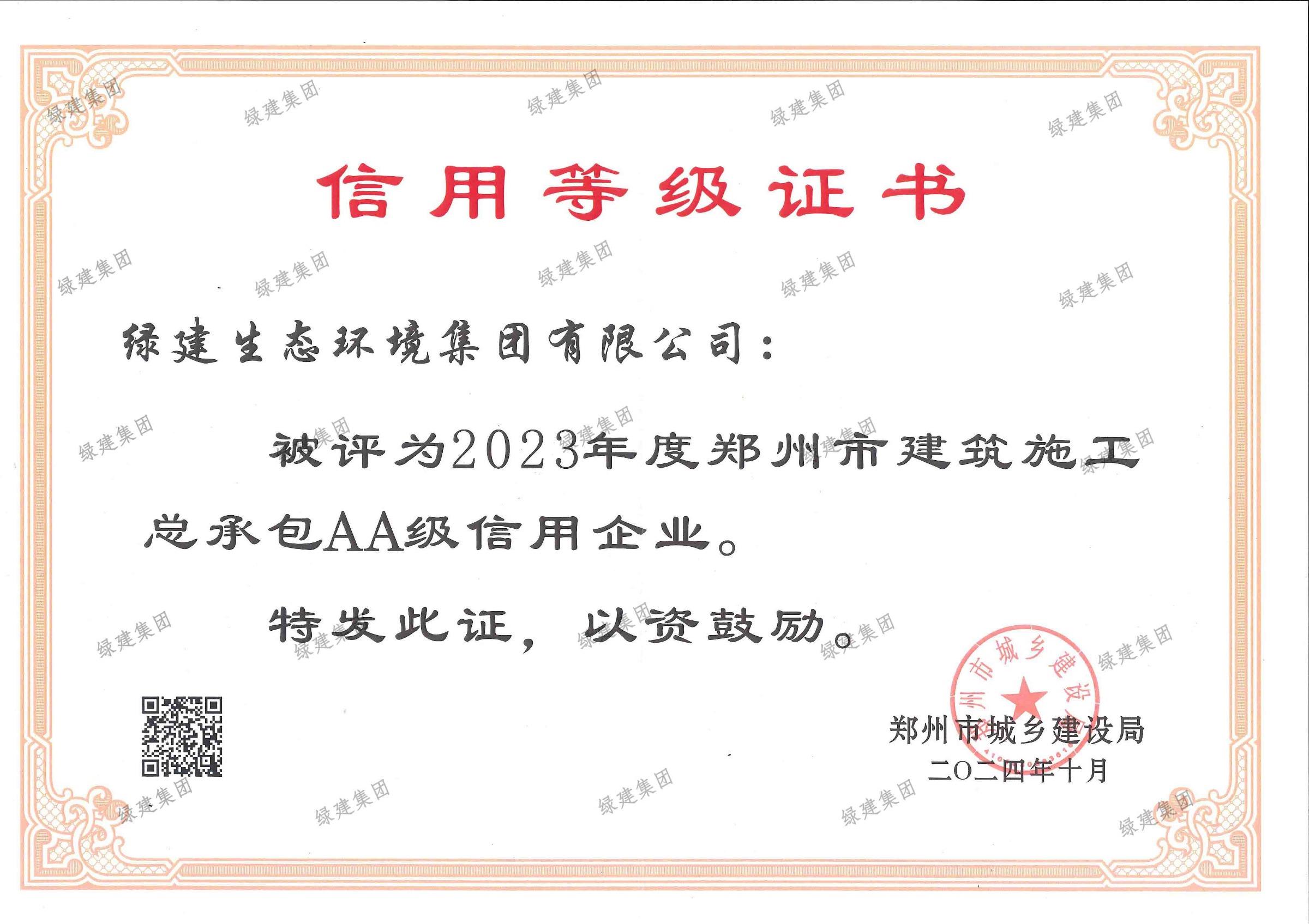 2023年度鄭州市建筑施工總承包AA級信用企業