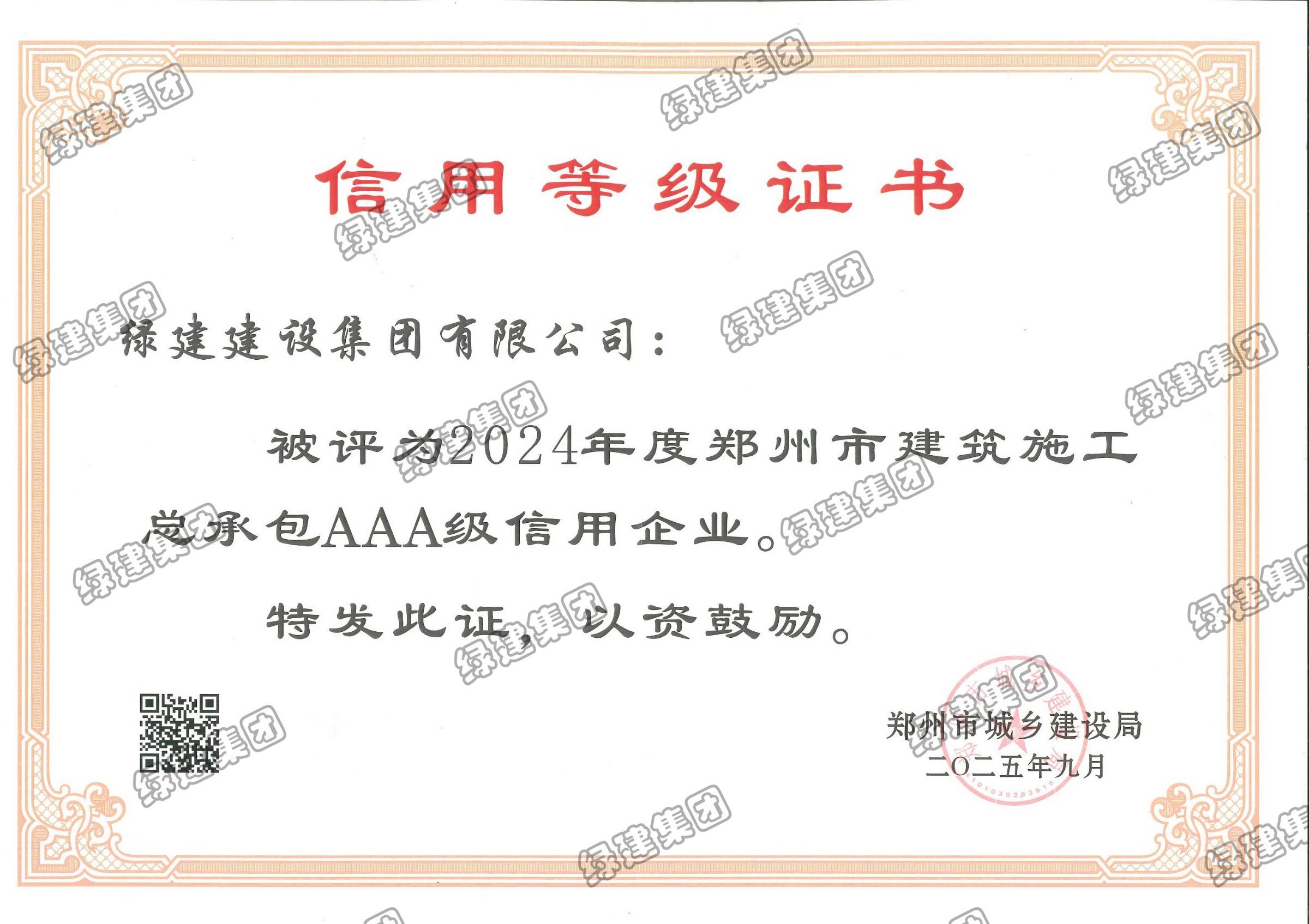 2024年度鄭州市建筑施工總承包AAA級信用企業(yè)